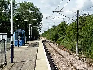 The line and station were opened on 1 June 1889 for goods and on 1 October 1889 for passenger services by the Great Eastern Railway.[1] The station had a single platform with a station building, a goods shed, a goods yard including cattle pens, and a 34-lever signal box. The freight service was withdrawn on 4 October 1965; the goods loop and signal box were closed on 7 December 1966. All the station buildings were demolished in 1968.[1] Electrification of the Wickford to Southminster line using 25 kV overhead line electrification (OLE) was completed on 12 May 1986.