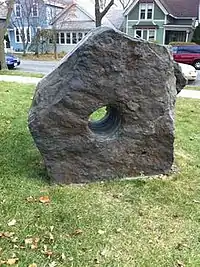 Peter Flanary's artwork outside the Bay View library is made up of four rocks placed around the building. The biggest and most prominent rock is a six-ton irregularly shaped piece of taconite iron ore, which is set into a concrete foundation. The iron ore has a 20 inch hole carved in the center.[1] The other three boulders are granite, and are each placed next to a tree. All of the rocks have words carved into them. The boulder next to the Aspen tree, reads Aspen. The boulder next to the Willow tree, reads Willow. The boulder next to the Catalpa plant, reads Catulpa (sic).