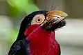 This is a conspicuous, large barbet at 26 centimetres (10 in) in overall length. It is fairly plump, with a short neck, large head and a shortish tail. The adult has a black crown, back, tail and breast band. The throat and belly are red and there is a yellow eye patch. The rump is white. The massive bill is very thick and yellow, and the well developed clump of bristles at its base give the species its name. Sexes are similar. The call is a growling scrawk.[9]