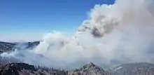 The Sugar Fire started on the southeast side of Sugarloaf Peak, three miles northeast of Beckwourth, California, near Nervino Airport, adjacent to the Plumas National Forest, on July 2.[2][10] It was first reported at around 10:30 AM on July 3, 2021, Despite significant fire growth on July 3 due to dry conditions, cloud cover and humidity helped tamper fire activity on July 4, allowing crews to make containment progress.[11] Twenty firefighters from Puerto Rico arrived to help fight the fires alongside California crews.[12] Houses and outbuildings in the immediate area were threatened, with fire crews implementing structure protection on July 3. By the next morning, July 4, the Sugar Fire had burned 470 acres (190 ha) and was 15 percent contained.[3] Evacuation warnings were put in place for the ranches along Maddalena Road.[13] That warning was rescinded on July 5 due to the fire's lack of growth.[14]