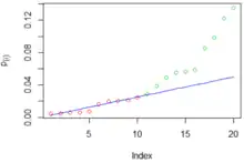 • The first paper is by Schweder and Spjotvoll (1982) who suggested plotting the ranked p-values and assessing the number of true null hypotheses () via an eye-fitted line starting from the largest p-values.[7] The p-values that deviate from this straight line then should correspond to the false null hypotheses. This idea was later developed into an algorithm and incorporated the estimation of into procedures such as Bonferroni, Holm or Hochberg.[8] This idea is closely related to the graphical interpretation of the BH procedure.