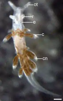 Juvenile stage (40-60% of development): At this stage the rudiments of oral tentacles (2nd pair of cephalic tentacles) and the paired, dorsal cerata appear.[6]