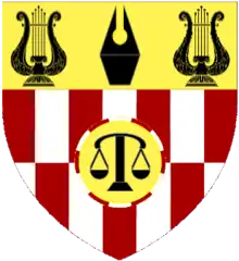Per fess Gules and Argent four pallets counterchanged overall a bezant charged with a balance Sable within a bordure compony Argent and Gules on a chief Or a pen nib between two lyres Sable.