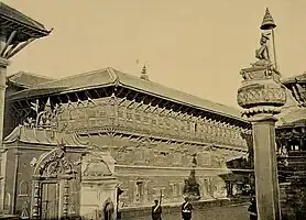 Near the western part of the square are two Vatsala temples, both of which were consecrated in 1695 by Jitamitra Malla.[40] The temple of Siddhi Vatsala, similar to the Nritya Vatsala is a stone temple and is generally referred as Lohan dega, translating to "stone temple".[36] It is dedicated to Siddhi Lakshmi, a form of Devi and is also referred as the temple of Siddhi Lakshmi. The temple is especially noted for its guardian statues, which includes a man and a woman holding a child and a chained dog, a pair of camels, horses, rhinoceroses and mythical beasts.[40] Its sister temple Yantra Vatsala, before being destroyed in the 1934 earthquake, used to exist north of it. Unlike the Siddhi Lakshmi temple, it was not restored after the earthquake and instead a one storey building has been constructed in order to shelter the image of the deity.[41] It is believed that Yantra Vatsala was built in a similar style to its sister temple, Siddhi Vatsala but a complete pre-1934 picture of the temple has not been discovered.[41]