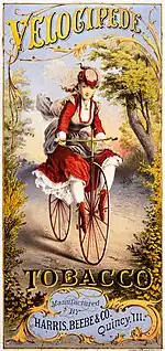 ![]() "Bicycling", a ca. 1887 color print showing one of the few ways in which it was socially acceptable for women to ride cycles, in the years before the invention of "safety bicycles" and the woman's "bicycle suit". |