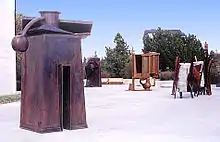The inaugural Big Things exhibition in 2002 was the first time the Royal Alberta Museum had ever displayed an exhibition of its kind, featuring nine large, abstract steel sculptures.[3] According to the museum's assistant director Tim Willis, "Dealing with abstract sculpture is not part of our core mandate.... It just goes to show how art can transform an inert public space.[5]" Artist Ryan McCourt sought out the venue in part for its cultural context, and in part due to the inherent practicality of the site. "The context of it being at a museum was much more appropriate than having it at the Law Courts or outside the Shaw Conference Centre," says McCourt,[4] while also noting that the museum's large stone facade and open concrete terrace space is especially conducive to viewing large sculptures.[2] Exhibited sculptures included Tilley, by Mark Bellows; Valour and Cowardice, by Andrew French; Radiant, by Peter Hide; Midway, by Ken Macklin; The Moment You've Been Waiting For and Spanish Castle, by Ryan McCourt; Almost Whole, by Royden Mills; and From the Model, by Susan Owen Kagan.[2][3]