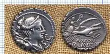 The first bigatus depicted Luna in her two-horse chariot. It continued in use along with the Dioscuri quadrigatus until 170 BC, when the denarius was temporarily suppressed. The denarius was revived around 157 BC with the Dioscuri type and a new bigatus depicting Victory in her biga, probably to commemorate Rome's dominance following the Battle of Pydna.[3] Tacitus and Plutarch mention a statue of Victory in a biga.[4]
