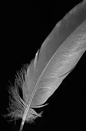 There are two basic types of feather: vaned feathers which cover the exterior of the body, and down feathers which are underneath the vaned feathers. The pennaceous feathers are vaned feathers. Also called contour feathers, pennaceous feathers arise from tracts and cover the entire body. A third rarer type of feather, the filoplume, is hairlike and are closely associated with pennaceous feathers and are often entirely hidden by them, with one or two filoplumes attached and sprouting from near the same point of the skin as each pennaceous feather, at least on a bird's head, neck and trunk.[14][15] Filoplumes are entirely absent in ratites.[16] In some passerines, filoplumes arise exposed beyond the pennaceous feathers on the neck.[1] The remiges, or flight feathers of the wing, and rectrices, or flight feathers of the tail, are the most important feathers for flight. A typical vaned feather features a main shaft, called the rachis. Fused to the rachis are a series of branches, or barbs; the barbs themselves are also branched and form the barbules. These barbules have minute hooks called barbicels for cross-attachment. Down feathers are fluffy because they lack barbicels, so the barbules float free of each other, allowing the down to trap air and provide excellent thermal insulation. At the base of the feather, the rachis expands to form the hollow tubular calamus (or quill) which inserts into a follicle in the skin. The basal part of the calamus is without vanes. This part is embedded within the skin follicle and has an opening at the base (proximal umbilicus) and a small opening on the side (distal umbilicus).[17]