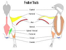 Contour feathers are not uniformly distributed on the skin of the bird except in some groups such as the penguins, ratites and screamers.[29] In most birds the feathers grow from specific tracts of skin called pterylae; between the pterylae there are regions which are free of feathers called apterylae (or apteria). Filoplumes and down may arise from the apterylae. The arrangement of these feather tracts, pterylosis or pterylography, varies across bird families and has been used in the past as a means for determining the evolutionary relationships of bird families.[30][31] Species that incubate their own eggs often lose their feathers on a region of their belly, forming a brooding patch.[32]