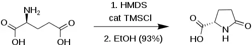 Silylation of glutamic acid with excess hexamethyldisilazane and catalytic TMSCl in either refluxing xylene or acetonitrile followed by dilution with alcohol (methanol or ethanol) yields the derived lactam pyroglutamic acid in good yield.