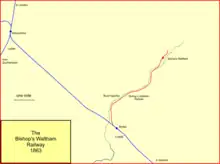 In 1863 a Petersfield and Bishop's Waltham Railway was proposed. This would approach Bishop's Waltham from the north-east, opposite the approach from Botley. The BWR must have assumed this would increase traffic on their line, making it a through railway accessible from the Guildford direction. The LSWR were against it at first, but later withdrew their opposition, and the Petersfield and Bishop's Waltham Railway was authorised by Act of 29 July 1864.[8][10] In fact the state of the money market turned so difficult that the company was unable to raise subscriptions to build its line, and it applied to the Board of Trade for a certificate of abandonment, which was granted on 28 July 1868; the company had expended £2,337, mainly on parliamentary expenses.[11][10]