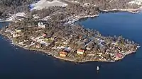 The eastern part of Blockhusudden is called Plommonbacken and has many country houses built in the 18th and 19th centuries. On the promontory, there is a café with views of Nacka. A lighthouse was installed in the middle of the Stockholm Channel in 1905. But in 1912 the lighthouse turned into AGA lighthouse by the invention of Gustaf Dalén.[3]