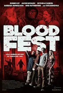 Blood Fest is a 2018 American comedy horror film written and directed by Owen Egerton and starring Robbie Kay, Seychelle Gabriel, and Jacob Batalon. Other cast members include Barbara Dunkelman, Nick Rutherford, and Tate Donovan, with a cameo by Zachary Levi.[1] The film was released on Rooster Teeth's video on demand service[2] and had its world premiere at the SXSW Film Festival in 2018.[3]