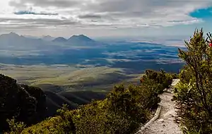 The Bluff Knoll trail is a round trip of about 6 kilometres (4 mi) taking three to four hours,[3] and has a Grade 4 rating of climbing difficulty, with some steep and rough steps.[3] In 2020 many parts of the trail were destroyed in the Black Summer bushfires, and has since been upgraded and improved.[4] The view from the summit encompasses the Stirling and Porongurup mountain ranges, as well as the coast near Albany.