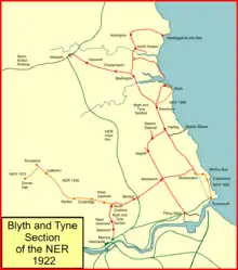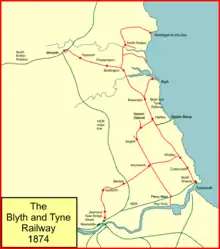 The Blyth and Tyne Railway was a railway company in Northumberland, England, incorporated by Act of Parliament on 30 June 1852.[1] It was created to unify the various private railways and waggonways built to carry coal from the Northumberland coalfield to Blyth and the River Tyne, which it took control of on 1st January 1853.[2] Over time, the railway expanded its network to reach Morpeth (1857/8),[lower-alpha 1] North Seaton (1859),[4] Tynemouth (1860/1),[lower-alpha 2] Newcastle upon Tyne (1864),[lower-alpha 3] and finally Newbiggin-by-the-Sea (1872).[9] It became part of the much larger North Eastern Railway in 1874.[10][11]