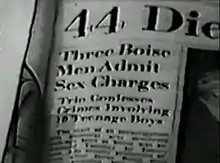 The Idaho Statesman, Boise's only daily newspaper, reported the arrests on November 2. News of the arrests ignited a panic in the citizens of Boise. In particular, mothers called the high school, the police and each other, turning in the names of suspected "perverts" and feeding their own and each other's fear.[8] On November 3, the paper ran an editorial under the headline "Crush the Monster". In it, the editors called homosexuality everything from "moral perversion" to a "cancerous growth... calling for immediate and systematic cauterization". The Statesman then called for "the whole sordid situation" to be "completely cleared up, and the premises thoroughly cleaned and disinfected" using "the full strength of county and city agencies".[9] The editorial increased the panic among Boise citizens, who decided that if the normally-staid Statesman was so alarmed at the situation then there must be good reason to be alarmed.[10]