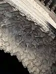 Each of the 13 consoles under the windows once supported a bronze bowl, seen in old photographs.[15][3] Historical accounts describe how at every hour a lead ball or weight fell into one of the bowls to make a ringing sound, while at the same time opening the "doors" or shutters of the corresponding window. The exact mechanism that operated this system has disappeared and its workings are unknown today. It was likely powered in some way by running water, and it appears the weights or balls may have been suspended by a lead line attached to the projecting consoles above the windows.[15] The surviving bronze bowls of the clock were removed in the later 20th century for ongoing study, though the structure itself was restored in the early 2000s.[16][15]