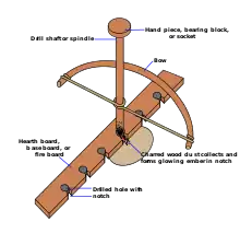 For use as a fire drill, the shaft should or (could) have a blunt end, which is placed into a small cavity of a stationary piece of wood (the fireboard). Turning the shaft with high speed and downward pressure generates heat, which eventually creates powdered charcoal and ignites it forming a small ember.[4]