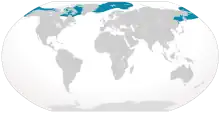 The bowhead whale is the only baleen whale to spend its entire life in the Arctic and subarctic waters.[40] The Alaskan population spends the winter months in the southwestern Bering Sea. The group migrates northward in the spring, following openings in the ice, into the Chukchi and Beaufort seas.[41] The whale's range varies depending on climate changes and on the forming/melting of ice.[42]