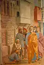 Filippino composed the five bystanders on the left, the Carmelites' drapery and the central part of St. Peter's arm in the "enthroned" representation. According to the Legenda Aurea (Golden Legend) by Jacobus de Voragine, after release from prison, St. Peter resuscitates, with St Paul's assistance, Theophilus's son, who had died fourteen years before.[17] So, people venerated St Peter and erected a new church to him, where he is enthroned so as to be revered and prayed by all.[18] However, the true meaning of this fresco rests with the politics of the time: that is, in the conflict between Florence and the Duchy of Milan.[19]