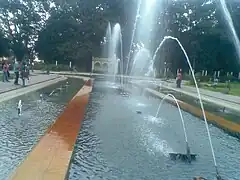 The Brindavan Gardens is a garden located 12 k.ms from the city of Mysore[1] in the Mandya District of the Indian State of Karnataka. It lies adjoining the Krishnarajasagara Dam which is built across the river Kaveri.[2] The work on laying out this garden was started in the year 1927 and completed in 1932.[3][4] Visited by close to 2 million tourists per year, the garden is one of the major attractions of Srirangapatna.[5] Sir Mirza Ismail, the Deewan of Mysore, a man with a penchant for gardens, founded the Brindavan Gardens (Krishnaraja Sagar Dam in particular) and built the Cauvery River high-level canal to irrigate 120,000 acres (490 km2) in modern Mandya district. The gardens were designed by German botanist and landscape designer Gustav Hermann Krumbiegel.