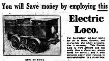 The B.E.V. battery rail locomotive (as described in 1920) was arranged with the battery boxes at either end and the controls in the middle. The wheelbase was 2ft 4in, and the length overall was 6 foot. Brakes applied to all 4 wheels, with the actuating linkage between the wheels. The motors were of specialised design for traction purposes with double wound fields "so that serial parallel control is arranged". The batteries consisted of 24 cells, size I.M.V. 6, with a capacity of 193 amp-hours. The cells were mounted in 4 hardwood boxes (pictures of later models in service show metal battery boxes). The range was 20 to 25 miles, with the rated speed being 6 mph unloaded and 5 mph loaded.[2]