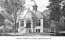 The library was founded in 1887, when the Brattleboro Library Association's "Free Library" was moved to George J. Brooks Free Library.[2] Brooks was a successful paper wholesale entrepreneur, and upon his return to his hometown founded the library.[2] The library was designed by New England architect Alexander Curtis Currier.[3]