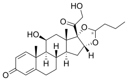 Budesonide, also known as 11β,21-dihydroxy-16α,17α-(butylidenebis(oxy))pregna-1,4-diene-3,20-dione, is a synthetic pregnane steroid and non-halogenated cyclic ketal corticosteroid.[44][45] It is the C16α hydroxyl, C16α,17α cyclic ketal with butyraldehyde derivative of prednisolone (11β,17α,21-trihydroxypregna-1,4-diene-3,20-dione).[44][45]
