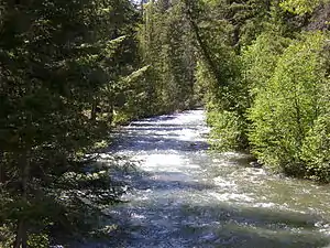 The Bumping River is a tributary of the Naches River, in Washington in the United States. It flows down the east side of the Cascade Range, through Wenatchee National Forest and the William O. Douglas Wilderness. From its source at Fish Lake near Crag Mountain, it flows northeast to Bumping Lake, a natural lake enlarged and regulated by Bumping Lake Dam. Below the dam, the Bumping River continues flowing northeast. It is joined by the American River, its main tributary, a few miles above its mouth where it joins the Little Naches River to form the Naches River.[4]