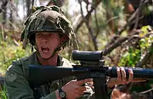 The C79 Optical sight is a small arms telescopic sight. Elcan names it as the SpecterOS3.4x, but in Canadian service, it is typically referred to as the C79 or the C79A2. A variant, the M145 Machine Gun Optic is in use by the US military. It is 3.4×28, meaning 3.4x magnification, and a 28mm diameter objective lens. A tritium illuminated reticle provides for normal and low-light conditions sighting.[1] It can be mounted to a variety of rifles and light machine guns using the M1913 Picatinny rail mounting system or the similar "Diemaco" rail system found on small arms produced by Diemaco/Colt Canada.[2] It is manufactured by Elcan and can be found on military service weapons around the world. Similar rifle sights are the Sight Unit Small Arms, Trilux (SUSAT) and the Advanced Combat Optical Gunsight (ACOG).