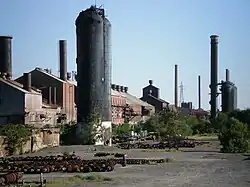 The Colorado Fuel and Iron Company (CF&I) was a large steel conglomerate founded by the merger of previous business interests in 1892.[1] By 1903 it was mainly owned and controlled by John D. Rockefeller and Jay Gould's financial heirs.[2] While it came to control many plants throughout the country, its main plant was a steel mill on the south side of Pueblo, Colorado, and was the city's main industry for most of its history. From 1901 to 1912, Colorado Fuel and Iron was one of the Dow Jones Industrials. The steel-market crash of 1982 led to the decline of the company. After going through several bankruptcies, the company was acquired by Oregon Steel Mills in 1993, and changed its name to Rocky Mountain Steel Mills.[3] In January 2007, Rocky Mountain Steel Mills, along with the rest of Oregon Steel's holdings, were acquired by EVRAZ Group, a Russian steel corporation, for $2.3 billion.