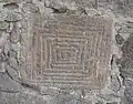 East of the main structure, is a hallway (south-north) at the southeast corner, it contains embedded three petroglyphs (see below gallery with composite pictures of petroglyphs).[1]
