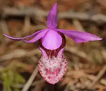Calypso is a genus of orchids containing one species, Calypso bulbosa, known as the calypso orchid, fairy slipper or Venus's slipper. It is a perennial member of the orchid family found in undisturbed northern and montane forests. It has a small pink, purple, pinkish-purple, or red flower accented with a white lip, darker purple spottings, and yellow beard. The genus Calypso takes its name from the Greek signifying concealment, as they tend to favor sheltered areas on conifer forest floors. The specific epithet, bulbosa, refers to the bulb-like corms.[2]