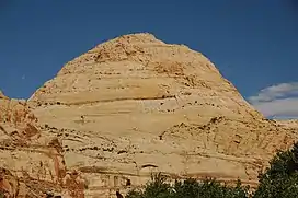 Capitol Dome is composed of Navajo Sandstone, which is believed to have formed about 180 million years ago as a giant sand sea, the largest in Earth's history.[4] In a hot, dry climate, wind blew over sand dunes, creating large, sweeping crossbeds which date to the Jurassic. Long after the sedimentary rocks were deposited, the Colorado Plateau was uplifted relatively evenly, keeping the layers roughly horizontal, but Capitol Reef is an exception because of the Waterpocket Fold, a classic monocline, which formed between 50 and 70 million years ago during the Laramide Orogeny.[3]