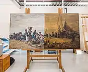 During the renovation process, the Torrescassana paintings were restored, a process carried out by the company Policromia in collaboration with the Generalitat de Catalunya’s Centre for the Restoration of Artefacts of Catalonia. The work consisted of cleaning the canvases, retouching the pictorial layer and reinforcing the mounts.[79] A number of ceramic tiles that had deteriorated were restored, a work carried out by Manel Diestre, of Sot’s Ceramics Studio, with the same stencilling technique as the originals.[80] The lamps in the house were also restored, a project led by the architects responsible for the restoration, alongside a number of specialists in various techniques such as wood, ceramics, metal, mural painting, fabric and stone.[81]