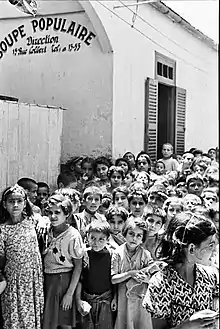 The initiative for the SP creation started in 1941, when population growth in the Casablanca Mellah was raising concerns over poor hygiene and undernutrition conditions.[15][12] Few documents remain of the SP first period; the number of children benefiting from the canteen at this time is unknown. Its goal was to provide hot meals as well as to educate underprivileged young Jewish children between the ages of 6 and 8. The SP received 300 children[16] per year . At the very beginning, only one teacher was hired and only a single class of thirty children was in operation[17][18] There are few press articles, about fifty photographic shots,[19] photos of charity balls in which money collections took place as well as some shots of benefactors. They were wealthy Jewish donors from Casablanca. Armand Tordjman was the first director and Mr. Elbaz was the accountant. Some assistants and cooks were also hired. Merchants of the central food market in Casablanca donated surpluses and sold food at reduced prices. The Civil Region (of Casablanca) provided coupons for fabrics, which were cut free of charge by Jewish tailoring companies and volunteers distributed the clothes. Millers provided flour at low cost, with which a baker made bread for free.[17][18] In 1941, when the SP was established, Jewish structures capable of integrating the children of the Mellah were not equipped to meet the needs. These structures: the JOINT, ORT, Alliance Israélite Universelle, OSE, and others were more active in the following years. After Morocco's independence in 1956, the Jewish population of the Mellah gradually left the ghetto, which became depopulated.