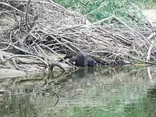Beavers were reintroduced in the Netherlands in 1988 after being completely exterminated in the 19th century. After its reintroduction in the Biesbosch, the Dutch population has spread considerably (supported by additional reintroductions), and can now be found in the Biesbosch and surrounding areas, along the Meuse in Limburg, and in the Gelderse Poort[33] and Oostvaardersplassen. In 2012, the population was estimated to be about 600 animals and could easily grow to 7000 in 20 years' time. According to the Mammal Society and the Dutch Water Board, this will cause a threat to the river dikes. The main problem is that beavers excavate corridors and caves in dikes, thereby undermining the stability of the dike, just as the muskrat and the coypu do.[34] If problems become unmanageable, as local administrators in Limburg fear, the beaver will be captured again.[35]