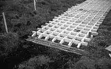 Research and development of cellular confinement systems (CCS) began with the U.S. Army Corps of Engineers in 1975 to devise a method for building tactical roads over soft ground.[4] Engineers found that sand-confinement systems performed better than conventional crushed stone sections and they could provide an expedient construction technique for access roads over soft ground, without being adversely affected by wet weather conditions.[5][6] The US Army Corps of Engineers in Vicksburg, Mississippi (1981) experimented with a number of confining systems, from plastic pipe mats, to slotted aluminum sheets to prefabricated polymeric systems called sand grids and then, cellular confinement systems. Today cellular confinement systems are typically made from strips 50–200 mm wide, ultrasonically welded at intervals along their width. The CCS is folded and shipped to the job site in a collapsed configuration.