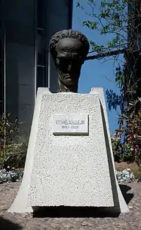 At the beginning of 1938, he worked as a language and literature professor in Paris,[5] but in March he suffered from physical exhaustion.[6] On March 24 he was hospitalized for an unknown disease (it was later understood that it was the reactivation of a kind of malaria, which he had suffered as a child), and on April 7 and 8 he became critically ill. He died a week later, on April 15,[7] a holy, rainy Friday in Paris. It was not a Thursday, as he seemed to have predicted in his poem «"Black Stone on a White Stone"». His death was fictionalized in Roberto Bolano's novel Monsieur Pain. He was embalmed. His funeral eulogy was written by the French writer Louis Aragon. On April 19, his remains were transferred to the Mansion of Culture, and later to the Montrouge cemetery.