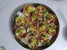 Chaat, or chāt (IAST: cāṭ) (lit. 'lick, tasting, delicacy') is a family of savoury snacks that originated in India, typically served as an hors d'oeuvre or at roadside tracks from stalls or food carts across South Asia in India, Pakistan, Nepal and Bangladesh.[1][2] With its origins in Uttar Pradesh, India,[3] chaat has become immensely popular in the rest of South Asia.