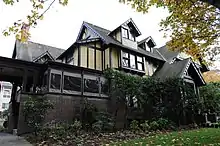 C. D. Stimson came to Seattle in 1888[6] as he and his brother Fred sought out virgin forest to exploit.[7] He built a mansion at 1204 Minor Avenue on First Hill for his family. It was designed by Spokane architect Kirtland Cutter and built in 1901, a couple of years after the Great Seattle Fire.[8] It is a Seattle Landmark.[9] It remained in the family for decades[10] and is now known as the Stimson-Green Mansion.[11]