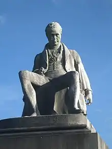 Tennant died at his home at Abercromby Place[11] in Glasgow on 1 October 1838. He is buried in Glasgow Necropolis where his monument stands on the upper plateau. The unusual statue thereon is in the form of a very casually (arguably slumped) seated figure. The sculpture is by Patrick Park (1811–1855) and appears to be based on Francis Chantrey's statue of James Watt in the nearby Hunterian Museum.