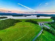 Chatuge Dam is a flood control and hydroelectric dam on the Hiwassee River in Clay County, in the U.S. state of North Carolina. The dam is the uppermost of three dams on the river owned and operated by the Tennessee Valley Authority, which built the dam in the early 1940s for flood storage and to provide flow regulation at Hiwassee Dam further downstream.[1] The dam impounds the 7,000-acre (2,800 ha) Chatuge Lake, which straddles the North Carolina-Georgia state line.[2] While originally built solely for flood storage, a generator installed at Chatuge in the 1950s gives the dam a small hydroelectric output.[3] At the time it was built, Chatuge Dam was the highest earthen dam in the world until the Aswan Dam was built in Egypt in 1964.[4] The dam and associated infrastructure was listed on the National Register of Historic Places in 2017.