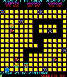 The screen is broken up into 14 x 13 tiles or checks. When the player passes over the tiles, they disappear so each tile can only be walked over once per level. Some tiles are taken up by skull and crossbones which kill the player if walked into. The skulls turn to time bombs one at a time and the player must walk over them to defuse them before they explode. They must avoid the skulls and make sure they do not block off a possible future route by circling it. Some tiles are also flags which can be collected for bonus points. When all skulls have turned to bombs and been defused, the level is complete and begins again at a harder level. As the game develops, stomping boots are introduced that move around the playing area. These are also deadly to the player.