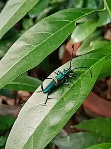 The adult beetles are a bit more than an inch long and are dark metallic blue with a transverse yellow to orange band midway on the elytra. The band is transverse in the inner half of the elytra and extends posteriorly on the outer edge.[1] The adults emerge in May and June after the rains and eggs are laid in the leaf axils of citrus trees. The larvae hatch and bore into the shoots, boring upwards and then girdling the tip of the branch which withers and turns black. It then bores inwards and pupates, emerging in a year. The populations can cause damage in citrus cultivation where they are managed by physical removal of the adults and by cutting of the branches showing girdling damage.[2]
