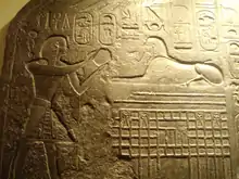 Khufu is depicted in several relief fragments found scattered in his necropolis and elsewhere. All reliefs were made of finely polished limestone. Some of them originate from the ruined pyramid temple and the destroyed causeway, where they once covered the walls completely. Others were found re-used in the pyramid necropolis of king Amenemhet I at Lisht and at Tanis and Bubastis.[10][32] One of the relief fragments shows the cartouche of Khufu with the phrase: "Building of the sanctuaries of the gods". Another one shows a row of fat oxen decorated with flowers—they were prepared as sacrifices during an offering procession. The guiding inscription calls them "the surroundings of Tefef serve Khufu", "beautiful bulls of Khufu" and "bawling for Khufu".[42] A third one shows the earliest known depiction of royal warfare: the scene is called "archers prepare", since it shows archers drawing their bows. And a fourth example shows the king with the double crown impaling a hippopotamus.[43][44]