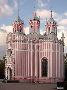 The church and Chesme Palace were the earliest Neo-Gothic constructions in the St Petersburg area.[3] Considered by some to be St Petersburg's single most impressive church,[4] it is a rare example of very early Gothic Revival influence in Russian church architecture.[5][6][7][8]