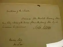 The Senate at first delayed confirming Marshall, as many senators hoped that Adams would choose a different individual to serve as chief justice. According to New Jersey Senator Jonathan Dayton, the Senate finally relented "lest another not so qualified, and more disgusting to the bench, should be substituted, and because it appeared that this gentleman [Marshall] was not privy to his own nomination".[57] Marshall was confirmed by the Senate on January 27, 1801, and took office on February 4. At the request of the president, he continued to serve as Secretary of State until Adams' term expired on March 4.[58] Consequently, Marshall was charged with delivering judicial commissions to the individuals who had been appointed to the positions created by the Midnight Judges Act.[59] Adams would later state that "my gift of John Marshall to the people of the United States was the proudest act of my life."[60]