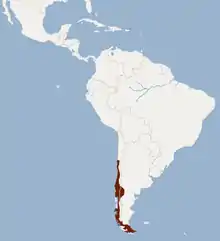 Apart from the southern big-eared brown bat, which lives in the same general locality, the Chilean myotis lives further south than any other bat species in the world.[2] The species lives primarily in Chile, south of about 30°S, but is also found in the westernmost regions of the Argentinian provinces of Neuquén, Río Negro, and Chubut. At the extreme southern end of its range, it is found across Tierra del Fuego, in both the Chilean and Argentinian parts of the island.[3] Over this wide area, it ranges from the semi-arid Chilean Matorral in the north to temperate and evergreen forests in the south.[2][4]