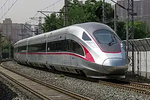 The CR400AF Fuxing (Chinese: 复兴号; pinyin: fù xīng hào) is a Chinese electric high-speed train that was developed by CRRC Changchun Railway Vehicles and manufactured by CRRC Qingdao Sifang. As part of the China Standardized EMU, the CR400AF is designed to operate at a cruise speed of 350 km/h (217 mph) and a maximum speed of 420 km/h (261 mph) in commercial service. Development on the project started in 2012, and the design plan was finished in September 2014. The first EMU rolled off the production line on 30 June 2015.[2] The series received its current designation of Fuxing in June 2017, with the nickname Red Dragon.[3] It is among the world's fastest conventional high-speed trains in regular service, with an operating speed of 350 km/h (217 mph).